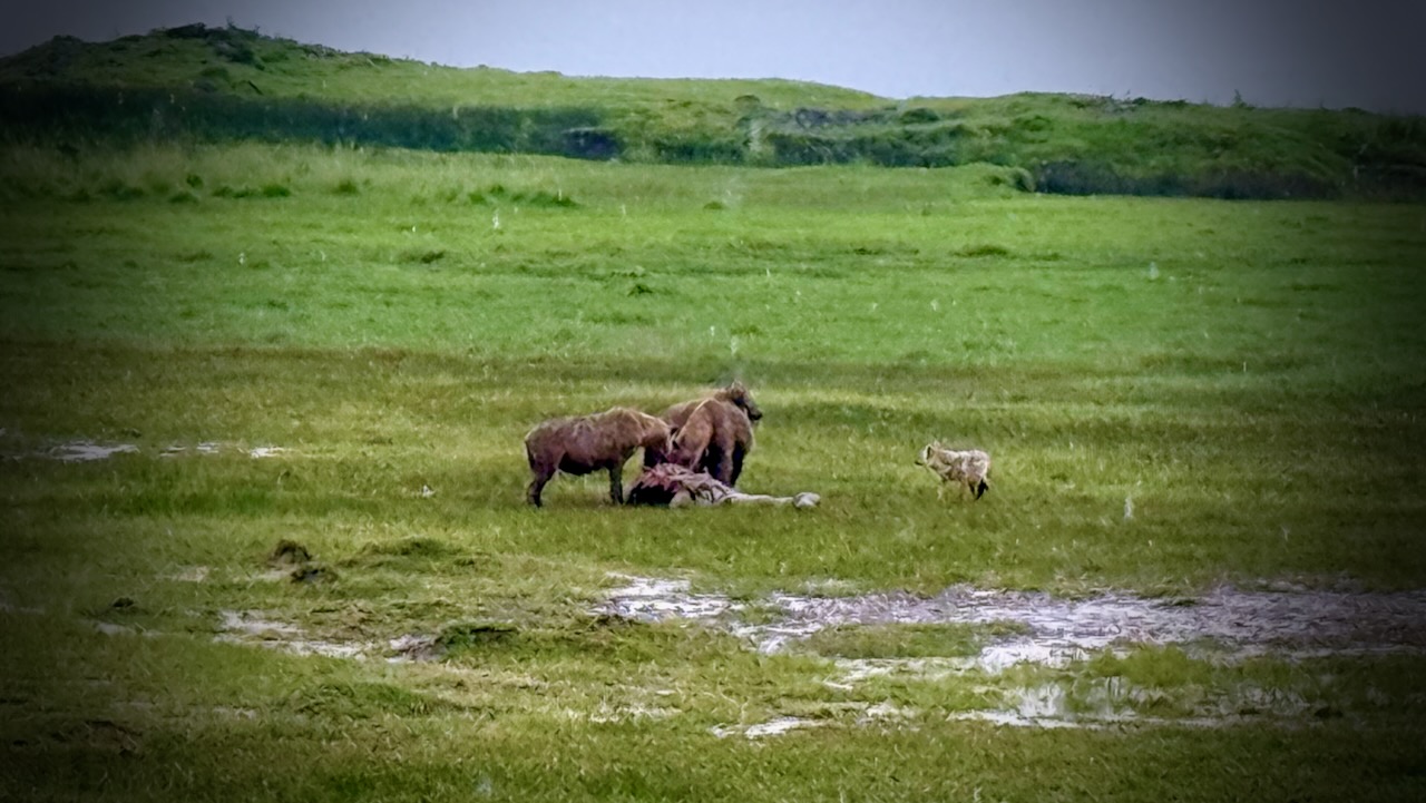 These hyenas were almost finished with their kill. A jackal was sneaking in to get quick bites, when it could.