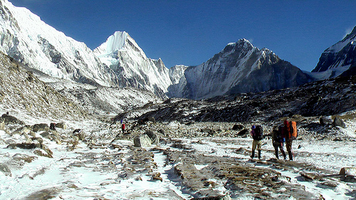The intimidating mountain in the background is Pumori 7161m (23,494 ft).