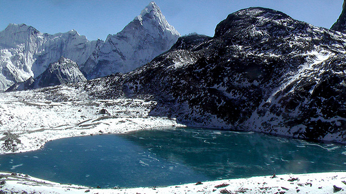 One of two access trails climbs quickly up and away from the Nuptse Glacier. And away from “teahouse trekking”. There are no facilities along the way. This is true high altitude wilderness.