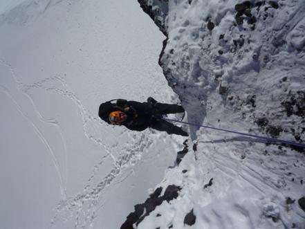 Hauling the packs was a challenge, especially since Mark led the climb with me belaying him through our makeshift anchors, and left his pack. Now I had my 35 pound pack, his 35 pound pack, and all of our ice tools and axes. FYI, free climbing raw, semi-icy rock isn’t my strongest ability. Luckily I had brought a BD ascender “on spec,” and was able to attach myself – and his pack – to the ascender, so every time I gained a few feet, I could haul his pack up beside/below me, and not lose it (other than the once before I figured this out, and only barely stopped it from sliding 1500 feet down a near-vertical snow face). Once I reached the last anchor, I was able to tie it to the loose end of our climbing rope and Mark hauled it the last 25 feet or so, leaving me to finish with just my own pack. There are advantages to being the bigger “pack mule” on the team, but this wasn’t one of them. 🙂