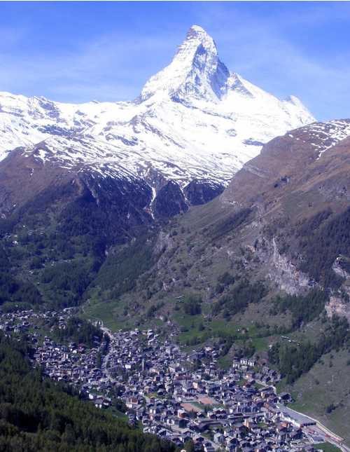 Zermatt … is in the German-speaking section of the canton of Valais in Switzerland. It has a population of about 5,800 inhabitants.