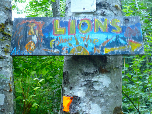 Due to too rough trail, I decided to escape the Howe Sound Crest Trail early. The nearest exit was via some new (wet) trail recently hacked out of the woods. It was flagged but poorly signed. People had created home made signage to compensate. This was the most artistic: