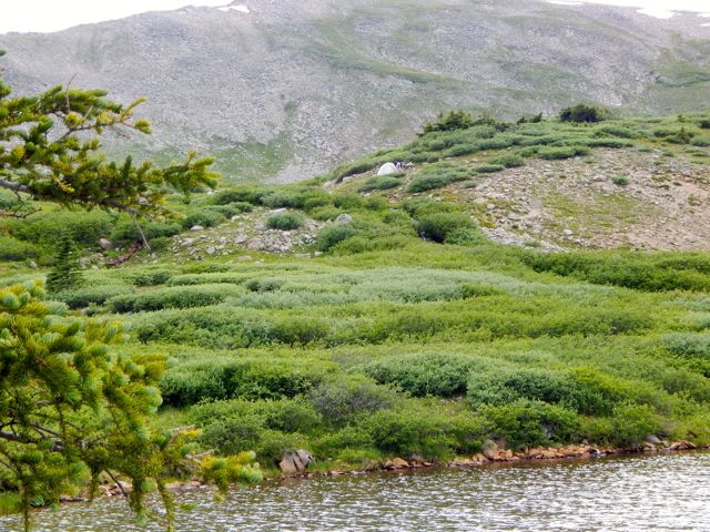 Wanting some shelter from (possible) lightning storm, I camped by the lake. Oddly there were almost no established tent sites. In the end I crammed my Hubba into this spot.