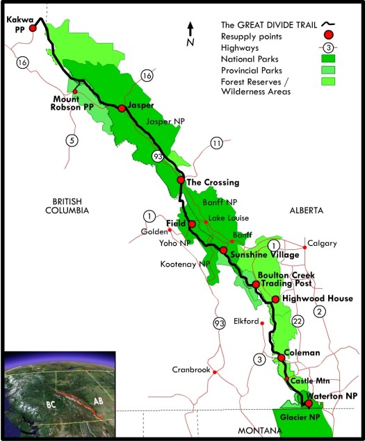 The Great Divide Trail traverses the continental divide between Alberta and British Columbia, wandering through the vast wilderness of the Canadian Rocky Mountains for more than 1100 kilometres. …