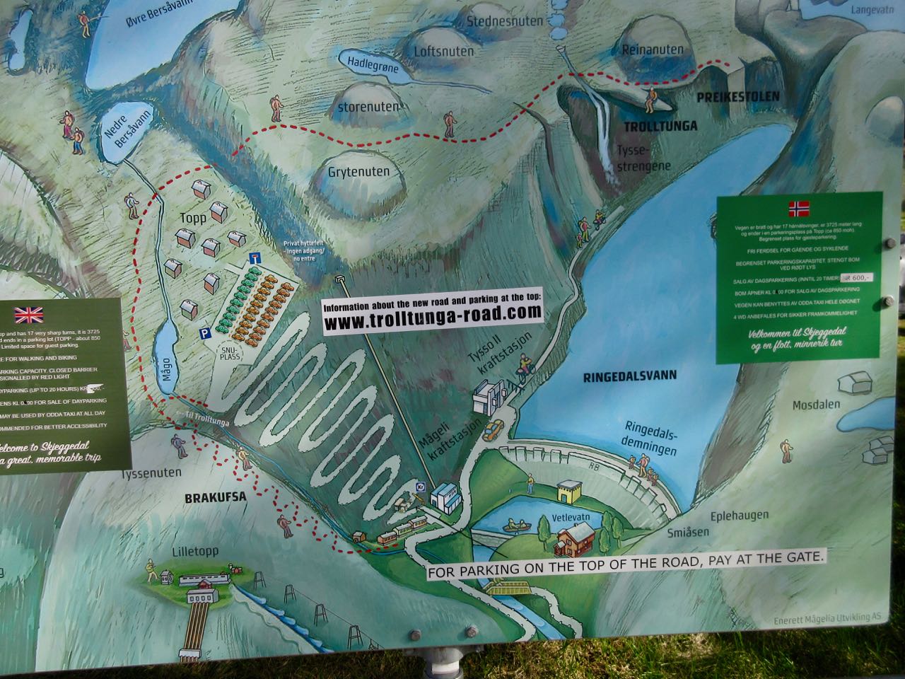 Parking at the trailhead costs 500 NOK/day (approx. 62 USD or 52 EUR). And over 300 spots were full the morning I arrived. I had to park 6km lower on the mountain for 300 NOK/day … and take a golf cart up for 100 NOK. Yeesh!