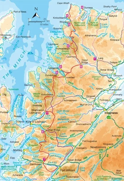 The Cape Wrath Trail is often referred to as Britain’s toughest long distance walk. Stretching approximately 230 miles (370 km) from the Highland hub of Fort William to the remote lighthouse of Cape Wrath, it is an unmarked and sometimes trailless route that passes through the wild and spectacular landscapes of northwestern Scotland. Due to the unpredictable weather and challenging terrain, it is a hike that is best suited to experienced ramblers who possess a good level of fitness, navigation skill, and a stoic disregard of having wet feet.