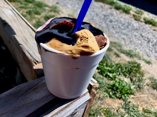 For example, after buying the required (and fairly useless) map, I decided to CARBO LOAD 🙄 with a half kilo of gourmet ice-cream. In that short visit I managed to lose my new map. Did it blow away? … And had to go back to the store to buy a replacement. ☹️