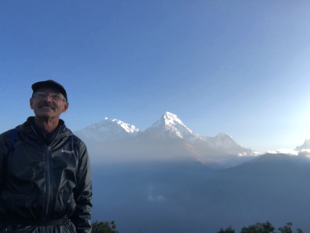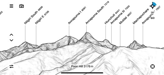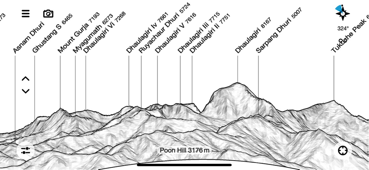 An ideal time to use my PeakFinder app: Dhaulagiri I (8167m), Tukuche (6920m), Nilgiri (6940m), Annapurna South, Annapurna I (8091m), Hiunchuli (6441m) and Tarke Kang (formerly known as Glacier Dome; 7193m). And Fishtail, of course.