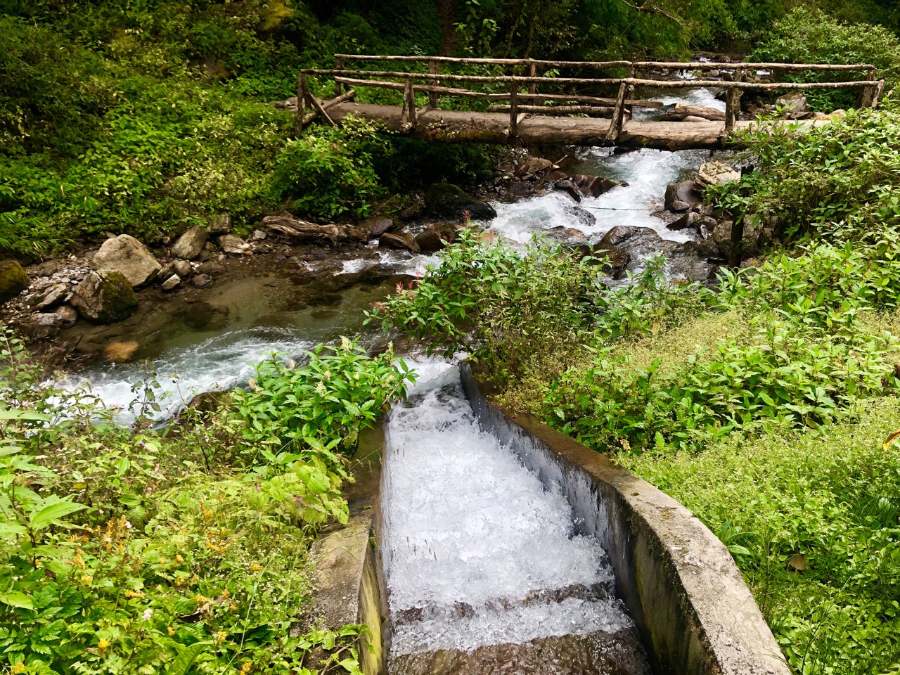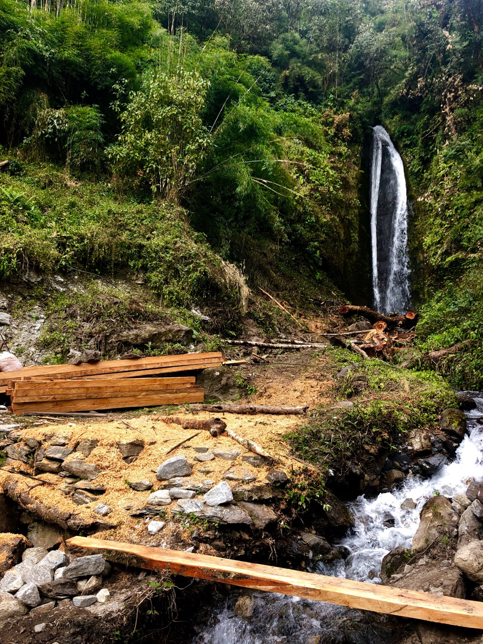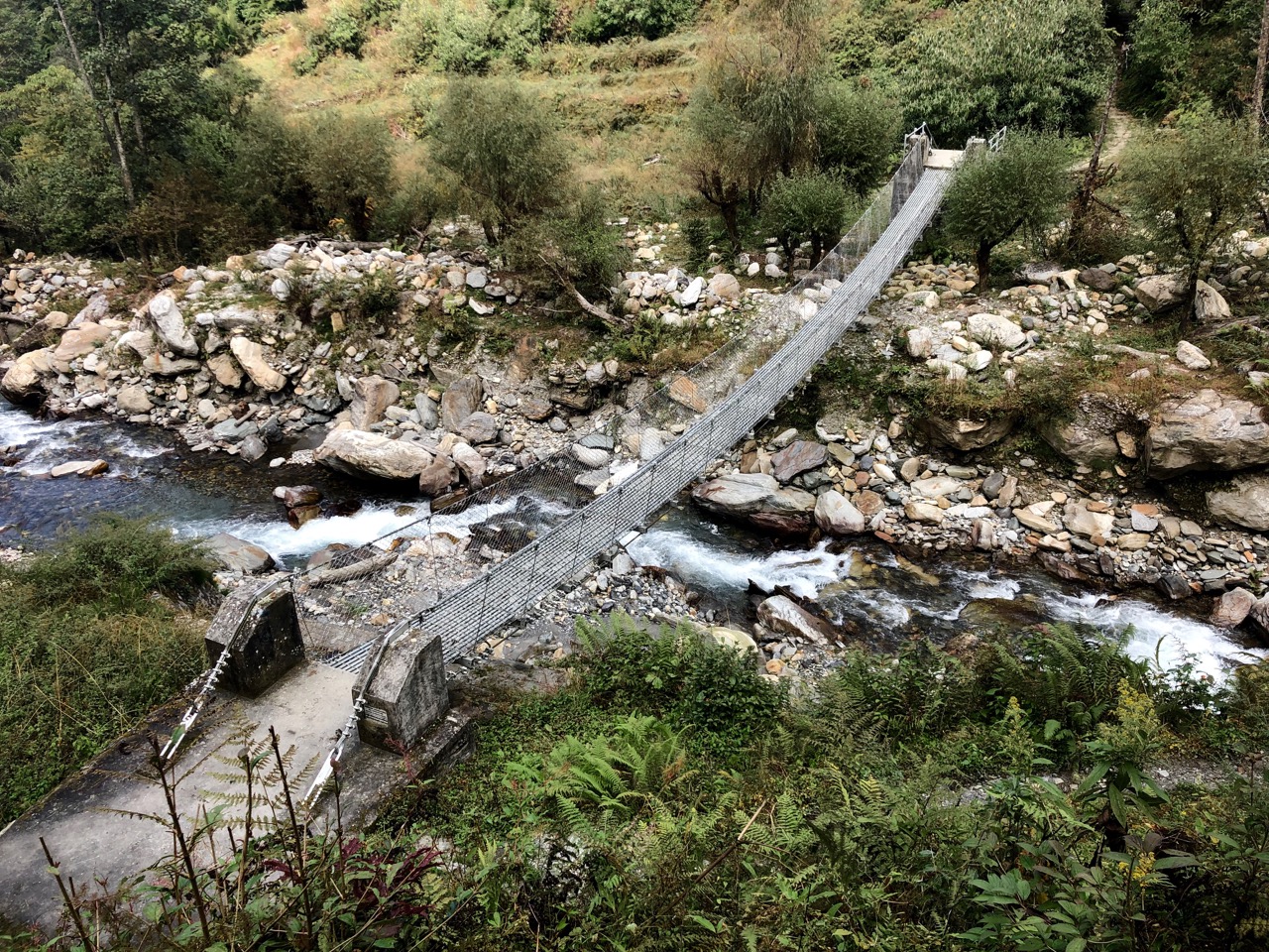 After climbing all the way UP to Ghorepani yesterday, I now dropped 900m to the Ghar Khola river. It was fast and enjoyable to descend instead of climbing. The non-motorized trail stays far away from new road building.