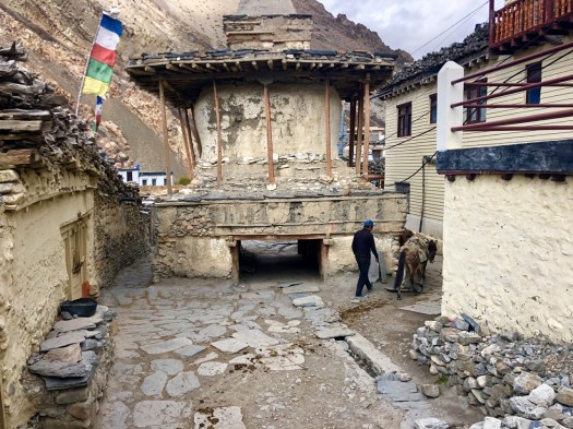 … closely packed mud houses, dark tunnels and alleys, imposing chortens and a large, ochre-coloured gompa perched above the town. …