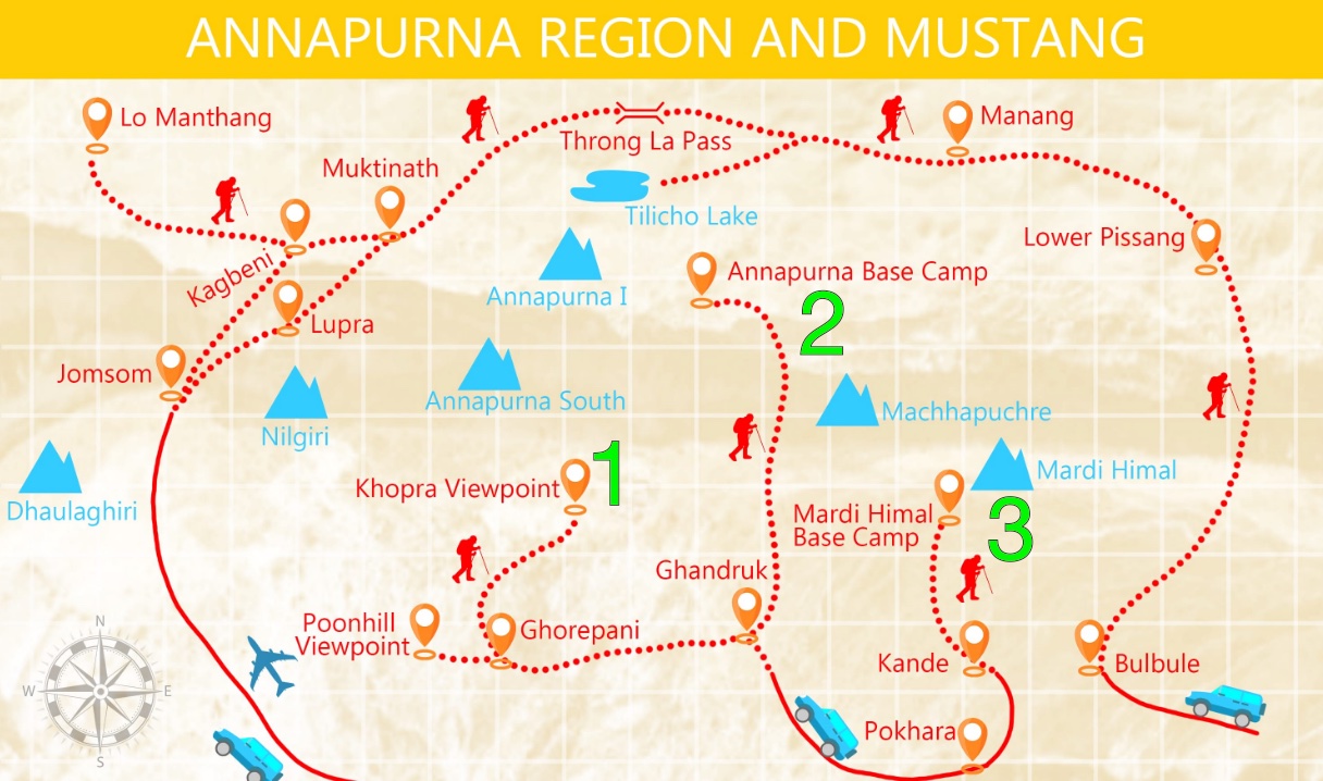 Annapurna Dhaulagiri Community Trek starting Banskharka (Bans Kharka) to acclimatize → continuing on 1. Khopra Ridge → connecting to 2. Annapurna Sanctuary (ABC) → finishing with 3. Mardi Himal .