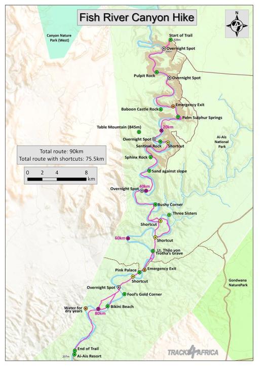 Total distance of Fish River canyon hike 86km, the river itself is longer but due to many shortcuts your walking distance is about 14km less. …