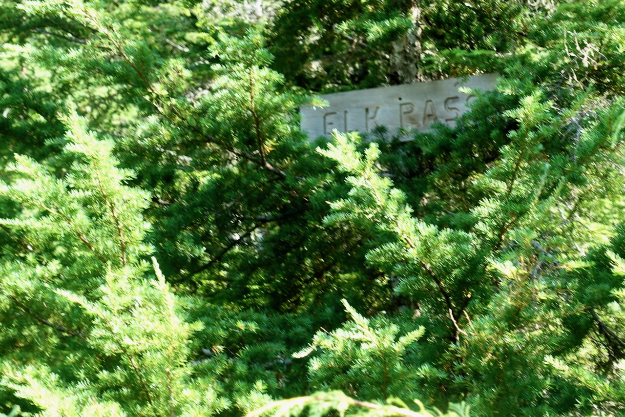 From there, search the trees on the left and you’ll find the high and overgrown Elk Pass sign.