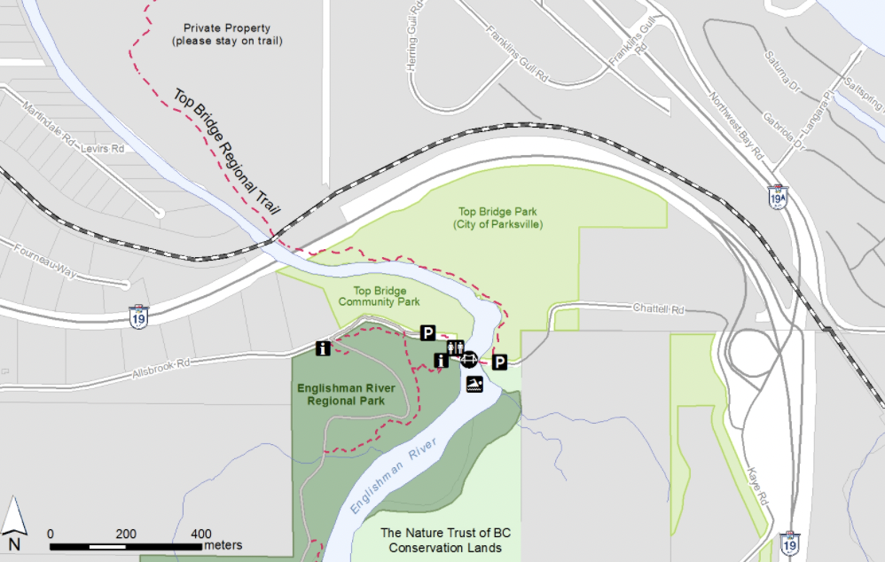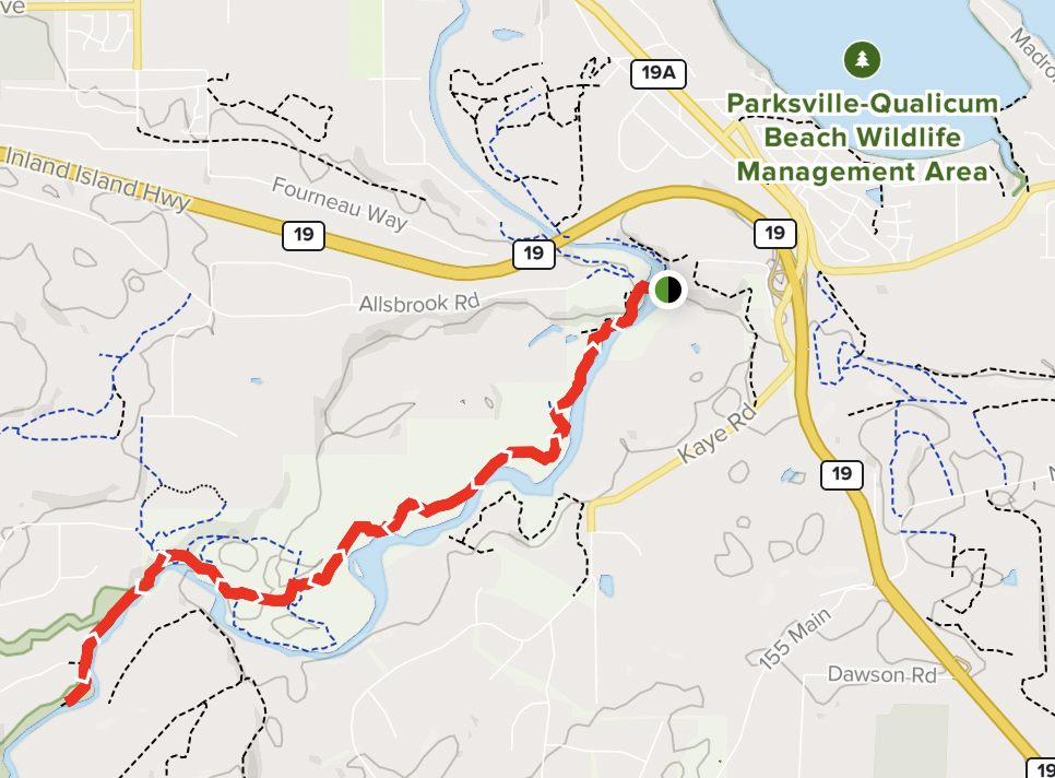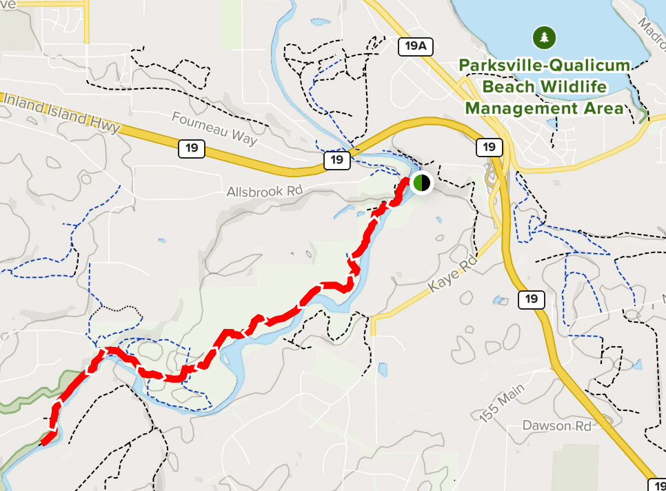 Most people park at the Top Bridge trailhead (green dot) close to highway 19 at Parksville. Head inland along the river for as far as they wish. Then backtrack.