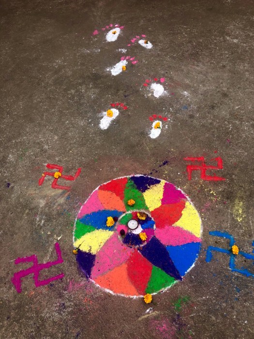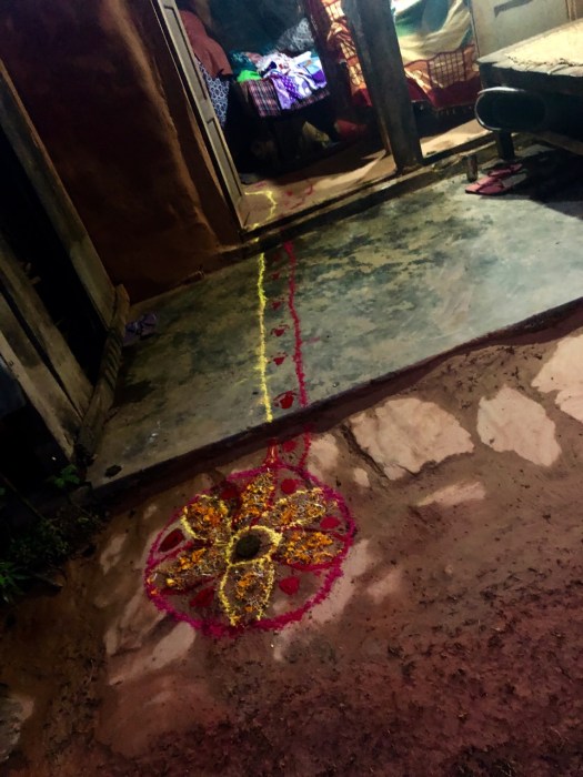 They offer puja (worship) to Lakshmi, the goddess of prosperity and wealth. Many homes have a trail into the house.