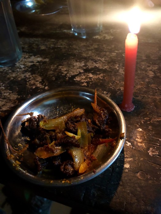 It was Dal Bhat for dinner, of course. The staple. But for an appetizer we were offered a special treat — dried, smoked, spicy goat meat from the high Himalaya. They call it sukuti.