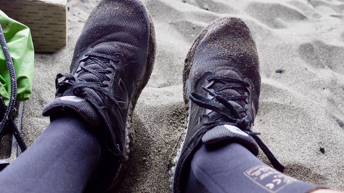 Put on the water shoes — trail runners with neoprene booties — in the morning as I’d be starting on the beach. Tide was low enough.