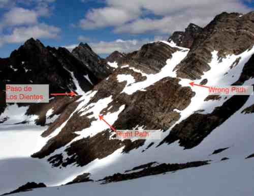 Everyone has navigation challenges on Dientes, this adventure more than most. Their goal on day 2 was to cross Paso de los Dientes. The guidebook said to “stay high”. … They stayed too high, eventually having to backtrack when the risk of a mini-avalanche got too great.