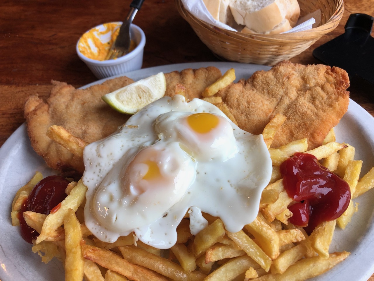 All I’d consumed this day was coffee. At 6:30pm I splurged on a huge meal. Breaded chicken a lo pobre.