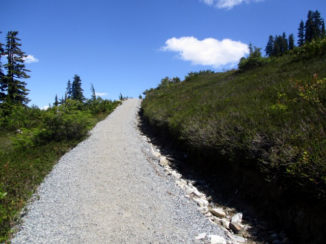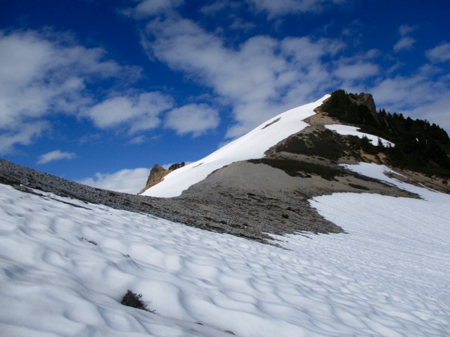 The similarly long ascent is on large, loose, sharp frost shattered rock. Going up is dangerous. I met 2 Argentinians descending there. SUPER dangerous. The worst of many bad slopes.