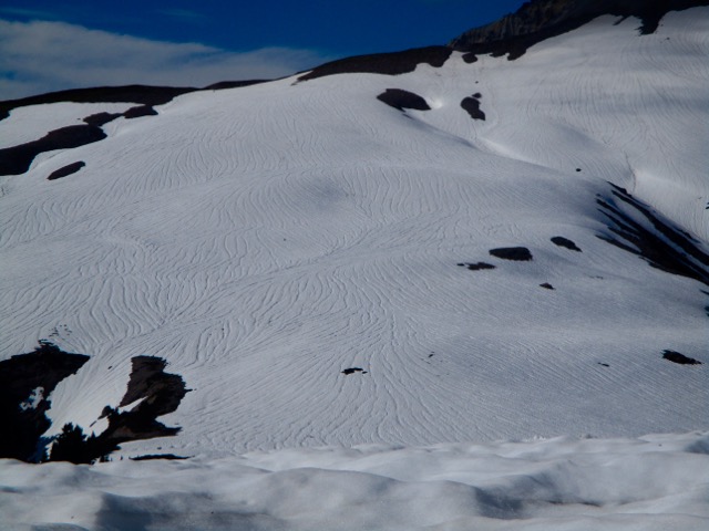 The similarly long ascent is on large, loose, sharp frost shattered rock. Going up is dangerous. I met 2 Argentinians descending there. SUPER dangerous. The worst of many bad slopes.