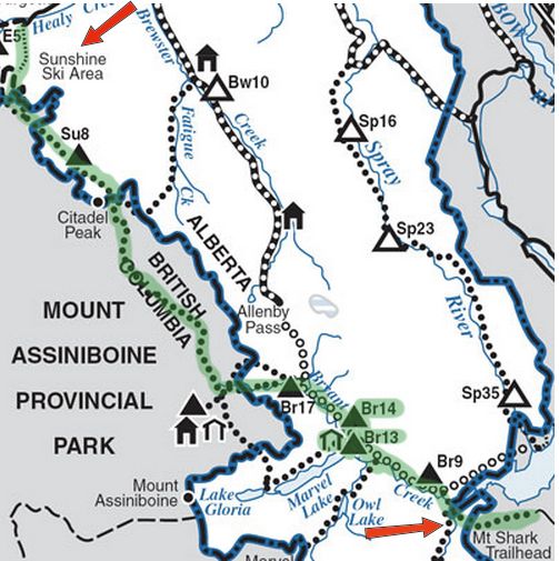 … Mt. Assiniboine can … be reached from the Sunshine Village ski area via the rambling alpine meadows of Citadel Pass.Either walk up the Sunshine Village limited access ski area maintenance road or ride the privately run shuttle up the 6.5 km to the base village. The trip exits via Bryant Creek at the Mt. Shark trailhead in Kananaskis Country, Alberta. Seasonal trail restrictions on Allenby Pass and Assiniboine Pass during buffalo berry season. …