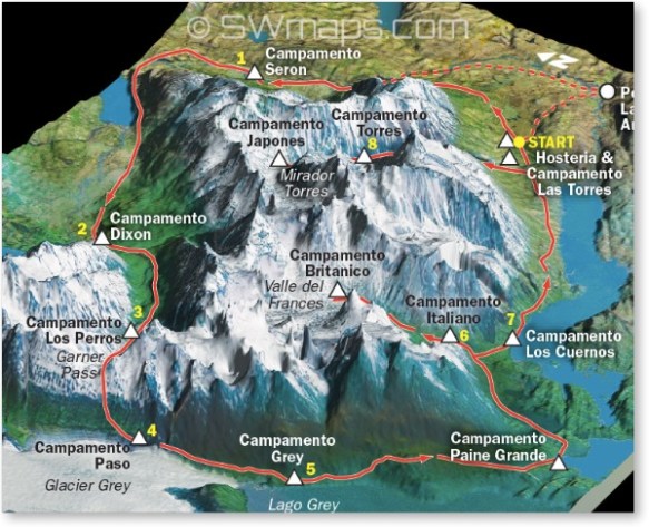 Paine Circuit 100km (62mi), recommended 9 days, 8 nights