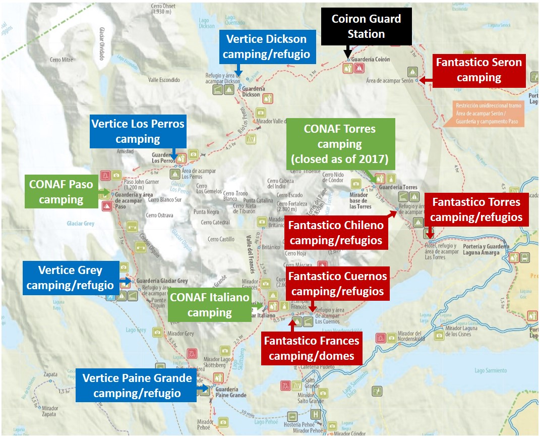 there are free campsites run by the Chilean government (CONAF) and sites run by two different private companies (Fantastico Sur and Vertice Patagonia).
